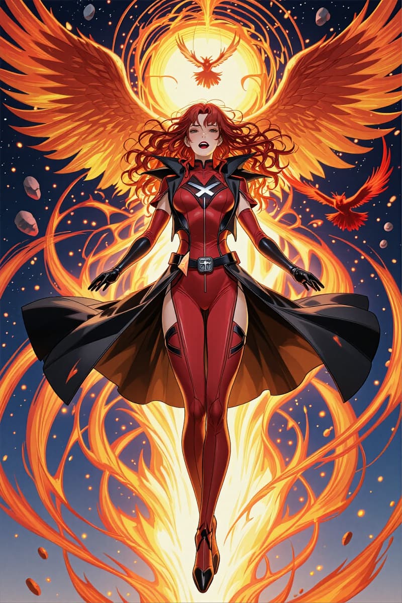 마블풍 피닉스 히로인, 긴 적발, 블랙 디테일이 있는 레드 바디수트, 타오르는 불꽃 위에 떠 있음, 뒤로 펼쳐진 거대한 황금 날개, 하늘의 피닉스 실루엣, 빛나는 불꽃 오라, 중앙 배치 전신 구성, 시네마틱 애니메이션 만화 아트, 강력한 마블 OC 메이커 예시