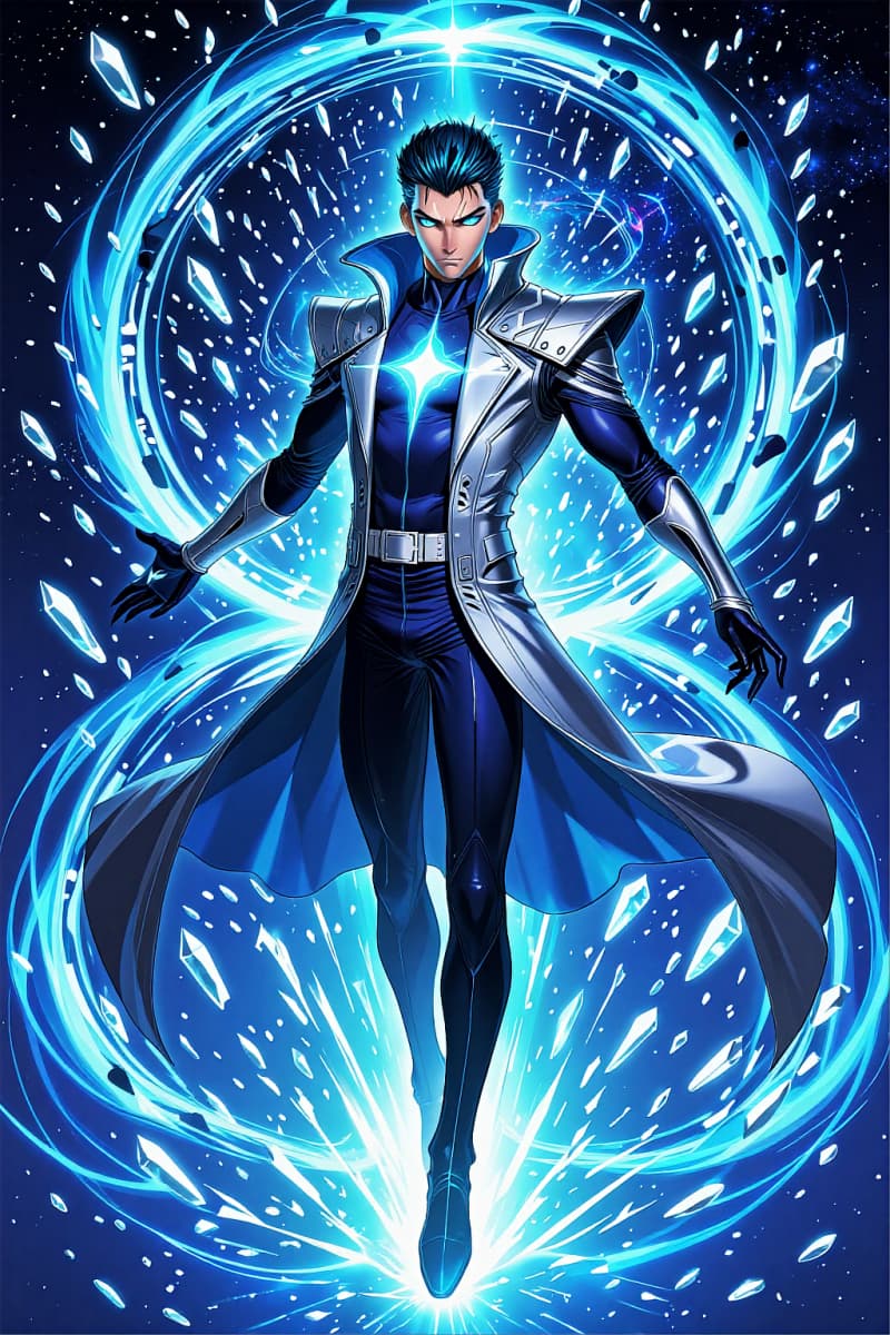 마블풍 우주 남성 슈퍼히어로, 날카로운 블루 헤어, 슬림한 네이비-실버 슈트, 가슴의 빛나는 별 엠블럼, 빛나는 푸른 포털 에너지 안에 서 있음, 크리스탈 입자와 은하수 배경, 대칭적 전신 포즈, 깔끔한 미래지향적 디자인, 애니메이션 만화 일러스트, 마블 슈퍼히어로 메이커 프롬프트 스타일