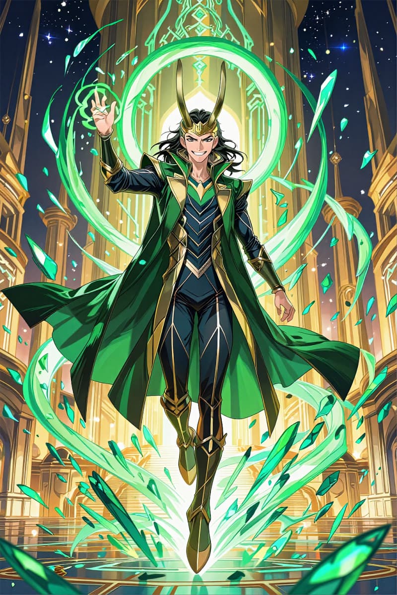 마블풍 트릭스터 메이지 캐릭터, 녹색-금색 롱코트, 뿔 달린 왕관, 자신감 넘치는 미소, 황금 궁전 내부에 떠 있음, 몸 주위를 맴도는 밝은 에메랄드 그린 마법 고리와 수정 조각들, 전신 판타지 슈퍼히어로 구성, 세련된 애니메이션 만화 렌더링, 나만의 마블 캐릭터 생성 스타일