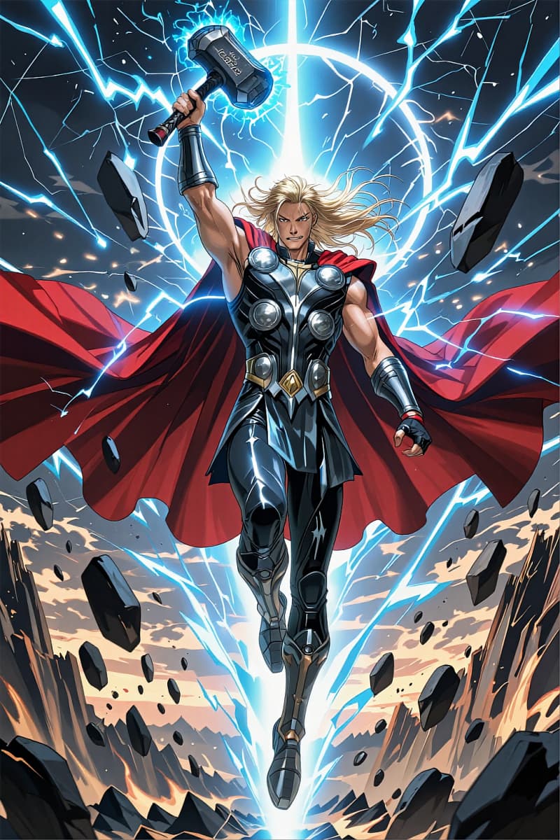 마블풍 천둥 신 슈퍼히어로, 긴 금발, 장갑 흑백 슈트, 흐르는 빨간 망토, 푸른 번개를 머금은 들어 올린 망치, 떠다니는 바위, 폭발하는 하늘 에너지, 극적인 전진 동작, 전신 히어로 구성, 시네마틱 애니메이션 만화 아트, 강력한 마블 캐릭터 메이커 예시