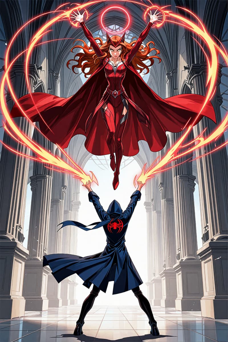 마블풍 진홍의 마법 히로인이 대성당 내부에 떠 있음, 양팔을 감싸는 빛나는 붉은 에너지 고리, 아래 후드 캐릭터와 격렬한 마법 결투, 흐르는 진홍색 망토, 우아한 전신 포즈, 빛나는 주문 효과, 수직 구성, 애니메이션 만화 스타일, 드라마틱한 마블 OC 제너레이터 장면