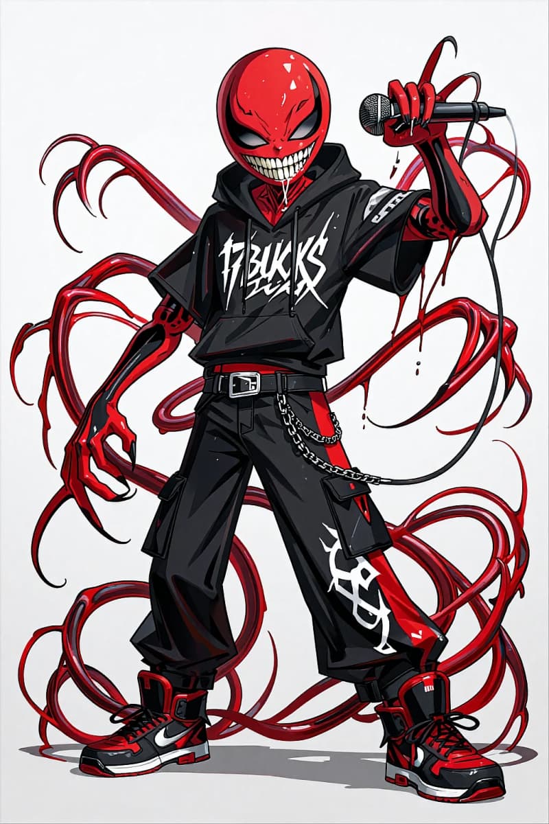 마블풍 심비오트 펑크 안티히어로, 광택나는 적흑 마스크와 날카로운 이빨 미소, 오버사이즈 블랙 스트리트웨어 후디, 체인 디테일 카고 팬츠, 적흑 스니커즈, 무대에서 마이크를 잡은 모습, 몸 뒤로 뻗은 긴 진홍색 촉수, 전신 포즈, 흰색 깔끔한 배경, 고대비 애니메이션 만화 일러스트, 굵은 선, 다이내믹한 마블 OC 메이커 스타일