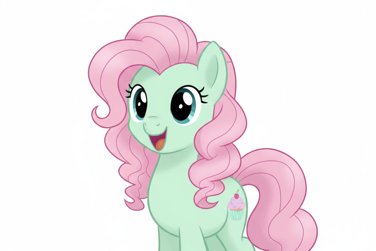 외형: 민트색 바디에 파스텔 핑크 컬리 갈기, 파란 눈, 컵케이크 큐티마크가 있는 어스 포니; 마이 리틀 포니 스타일; 행복한 표정; 단일 캐릭터, 상반신 촬영, 시선을 마주침; 애니메이션 영감을 받은 렌더링; 심플한 흰색 배경.