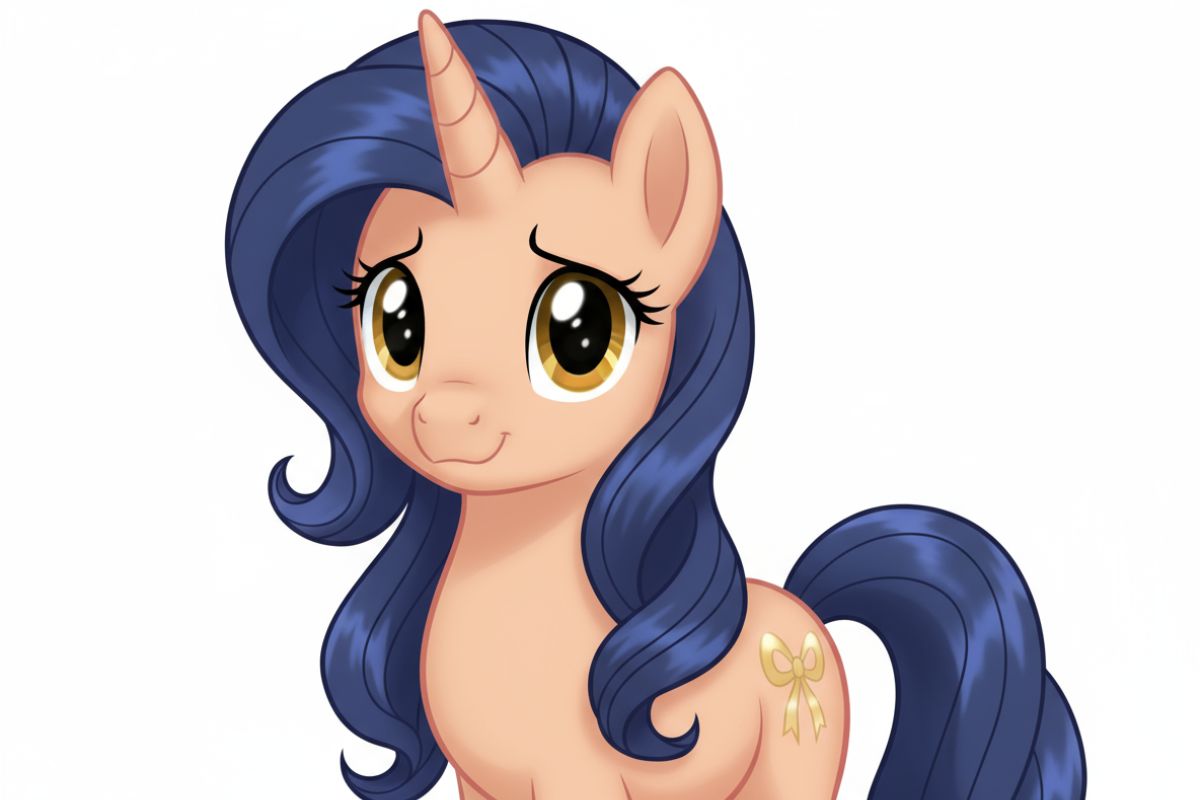 외형: 포니, 유니콘, 부드러운 복숭아색 몸체, 네이비 블루 갈기, 우아한 웨이브 머리, 황금 눈, 리본 큐티마크, 마이 리틀 포니, 수줍은 미소, 단일 캐릭터, 상반신