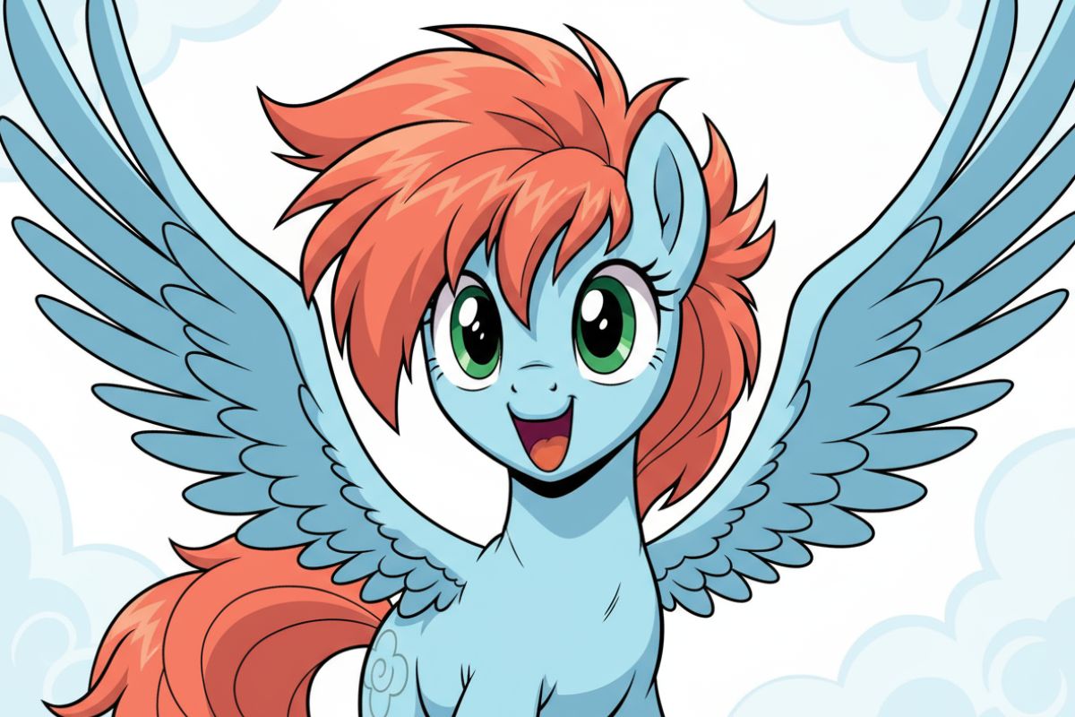 외형: 포니, 페가수스, 연한 파란색 바디, 산호색 주황색 갈기, 헝클어진 짧은 머리, 밝은 녹색 눈, 구름 소용돌이 큐티마크, 마이 리틀 포니, 활기찬 포즈, 단일 캐릭터, 상반신》