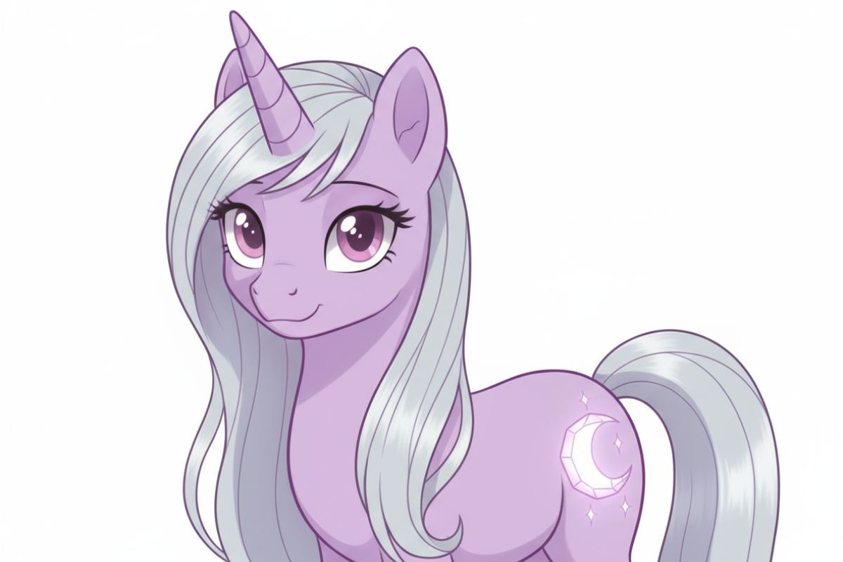 외형: 라일락 바디에 은빛 긴 직모 갈기, 분홍색 눈, 달-크리스탈 큐티마크가 있는 유니콘 포니; 마이 리틀 포니 스타일; 차분한 표정; 단일 캐릭터, 상반신 초상.