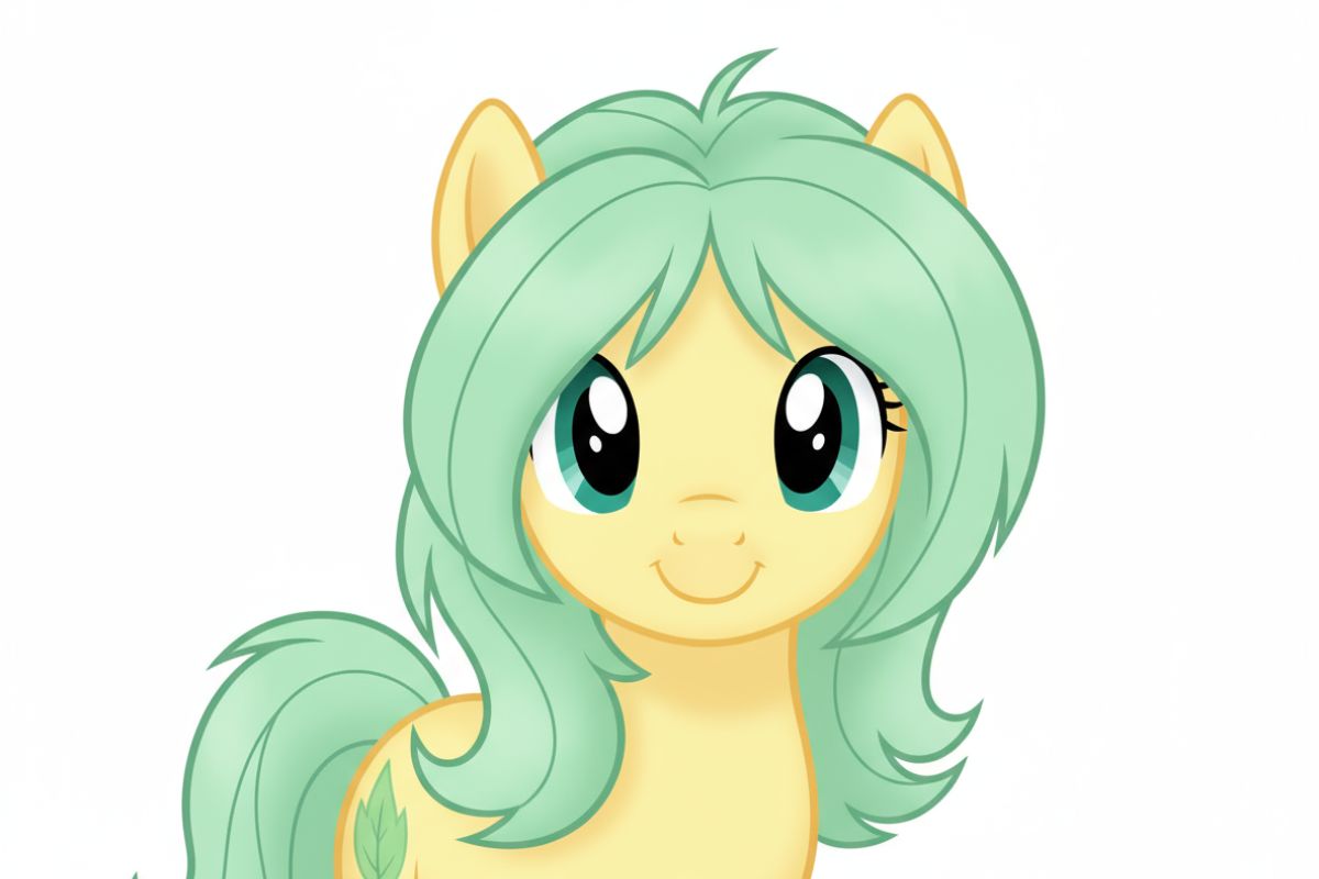 외형: 포니, 어스 포니, 파스텔 옐로우 바디, 민트 그린 갈기, 풍성한 중간 길이 머리, 틸 색 눈, 잎사귀 큐티마크, 마이 리틀 포니, 부드러운 미소, 단일 캐릭터, 상반신, 시선을 마주침, 애니메이션 스타일, 심플한 배경, 흰색 배경