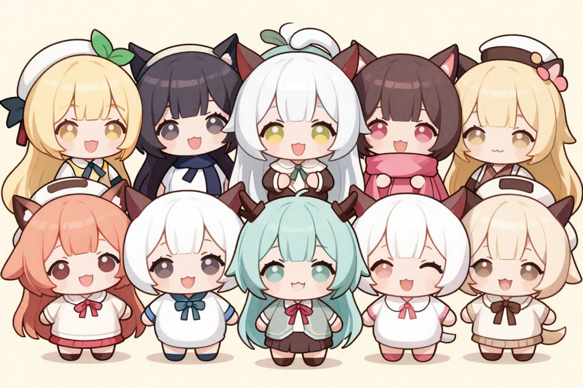 選擇可愛、酷炫、元氣、酷妹或傲嬌表情。控制取景(半身、三分之二或全身)、攝影角度與光線,獲得一致結果。